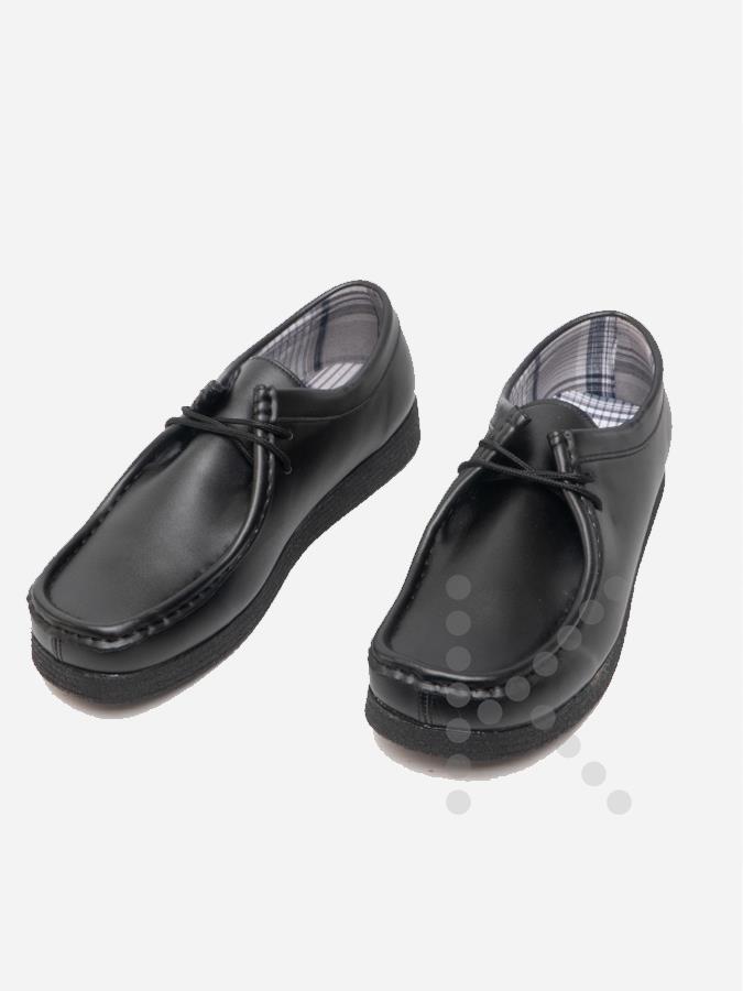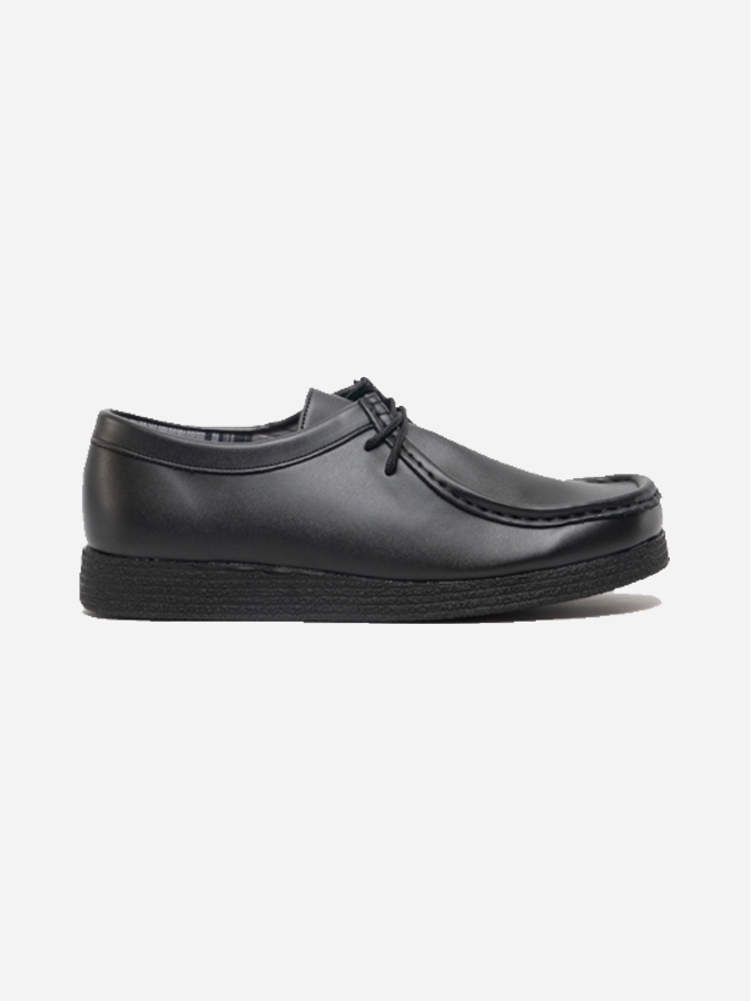 Black coated action leather lace up shoes. Apron para shoe with textile lining and sock. Finished with a wedge TR sole. Durable yet comfortable making it ideal for school.